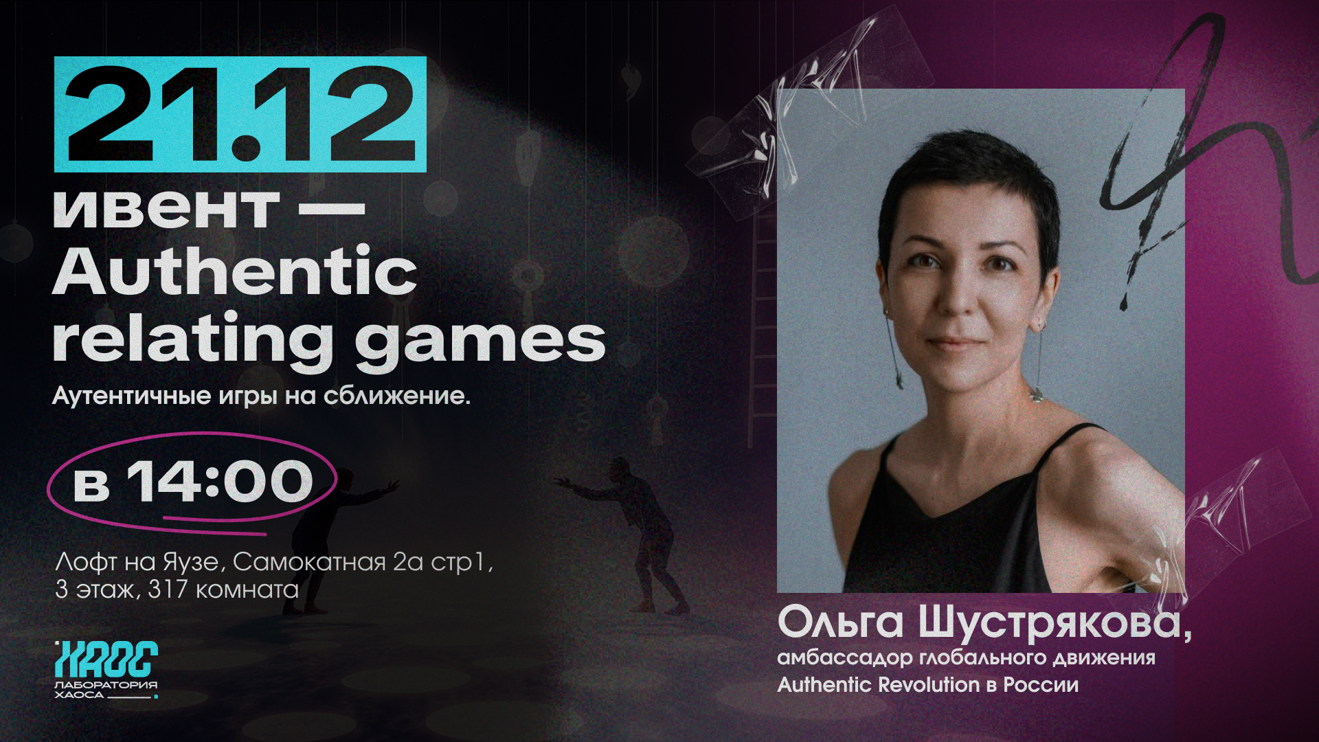 Игры проведет: Ольга Шустрякова, амбассадор глобального движения Authentic Revolution в России. С 2019 года проводит вечера аутентичного общения для русскоязычных сообществ, с 2020 года — ивенты и курсы онлайн. Входит в международную команду фасилитаторов аутентичного общения, проходит наставничество в Authentic Revolution Trainings и The Connection Institute.